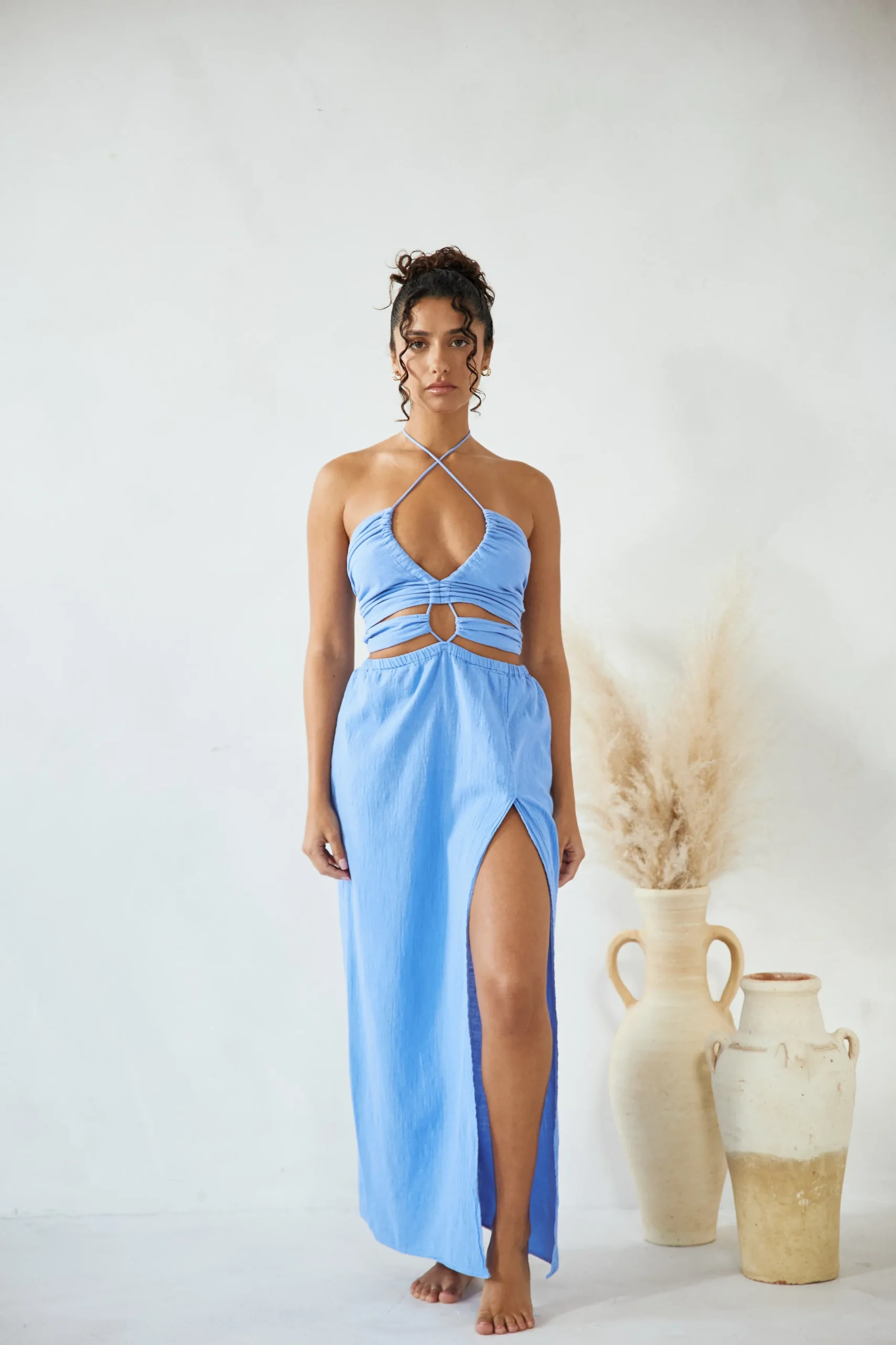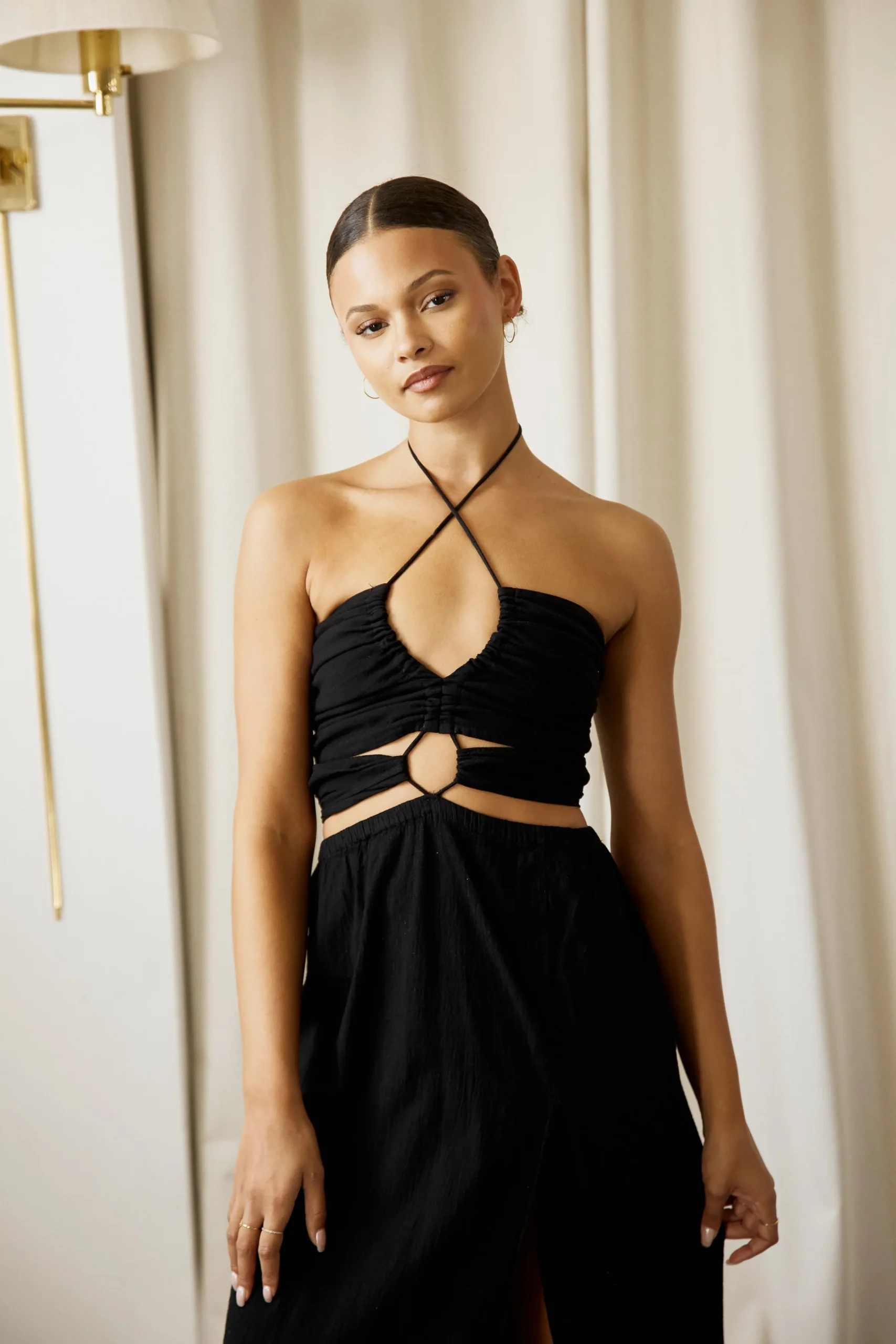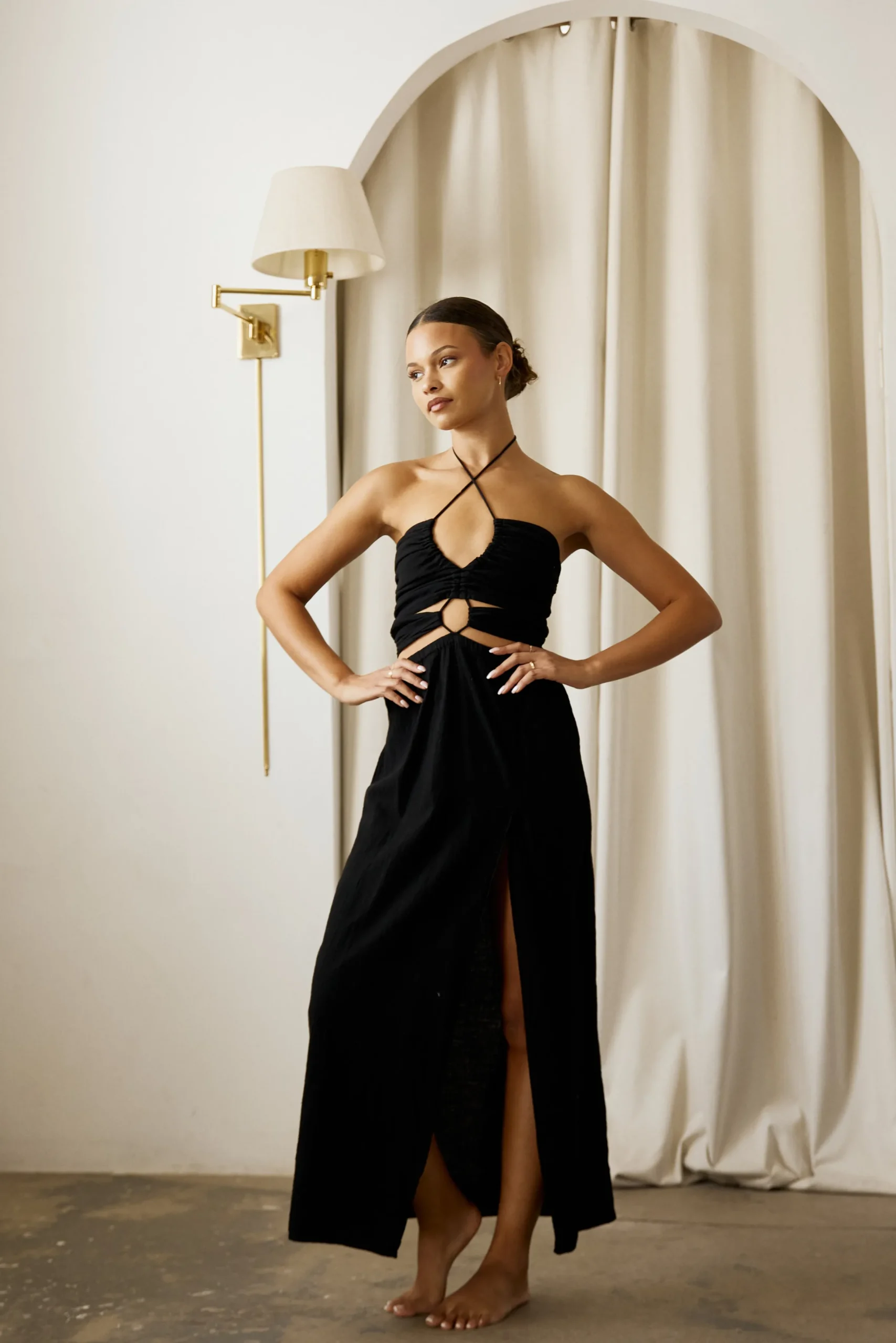 The perfect dressfor a night out or special event, the Andrea Dress is made from a high quality cotton fabric. It features an adjustable front, elastic back and a slit along the front. This piece can be styled for many looks. Style itup for your next event!