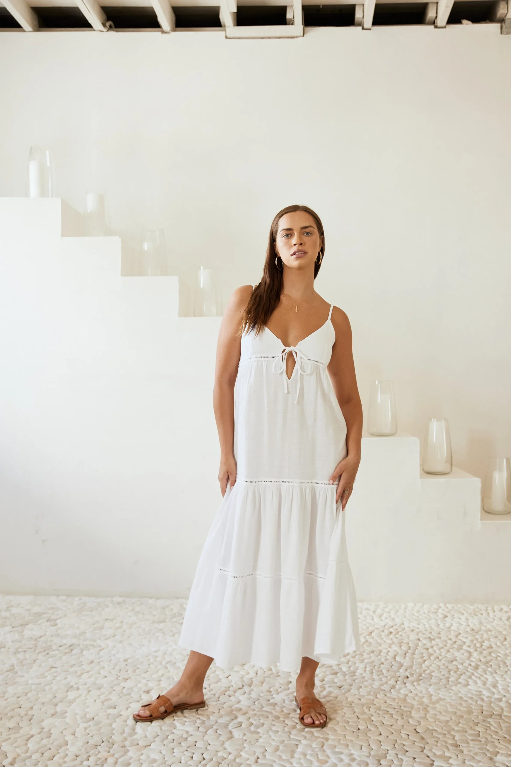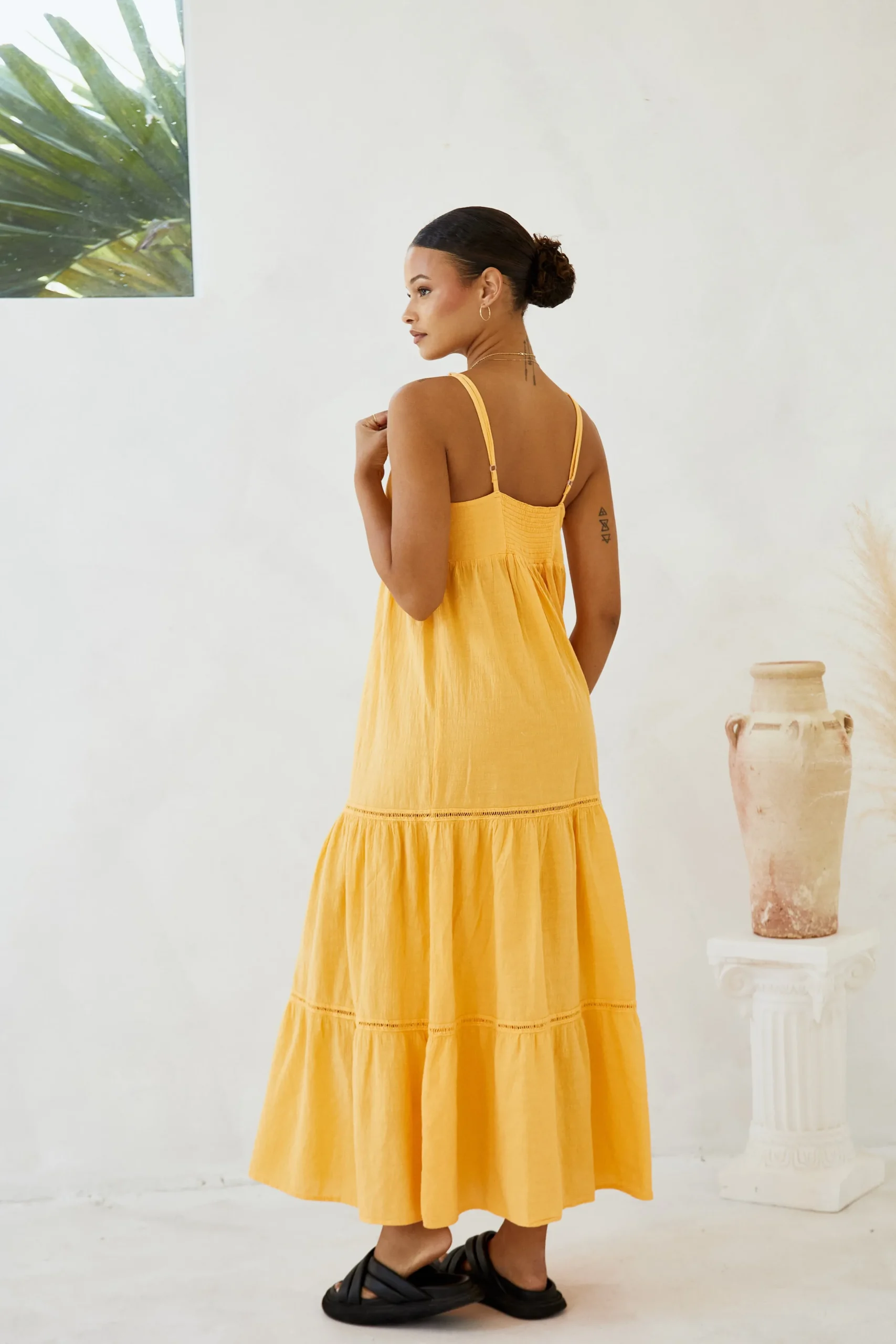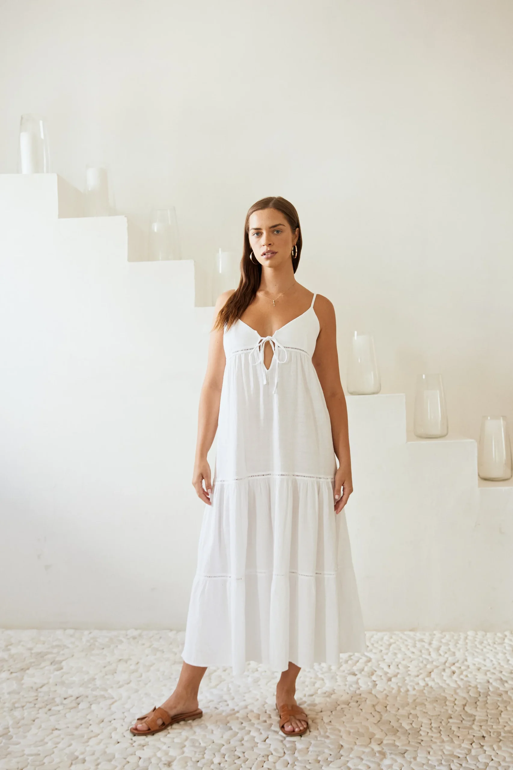 From beach to lunch! The AnetaDress is made from a lightweight cotton fabric with a crochet detail.It is a flowydress featuring adjustable straps and subtlecrochet detail throughout.Pair with sandals for an effortless classy look.