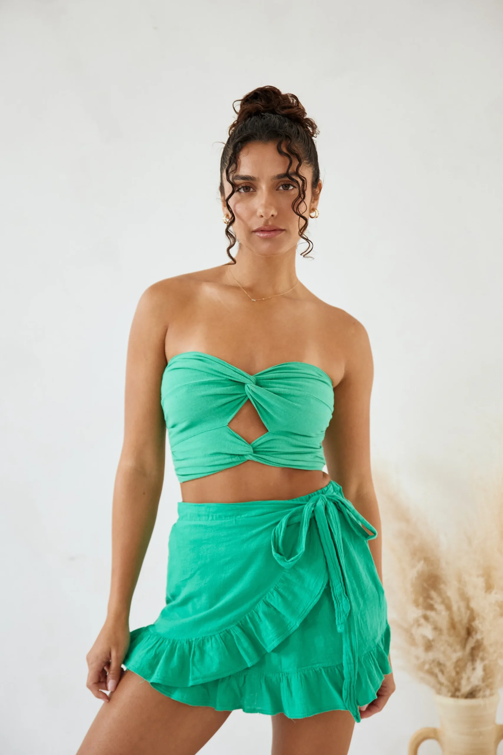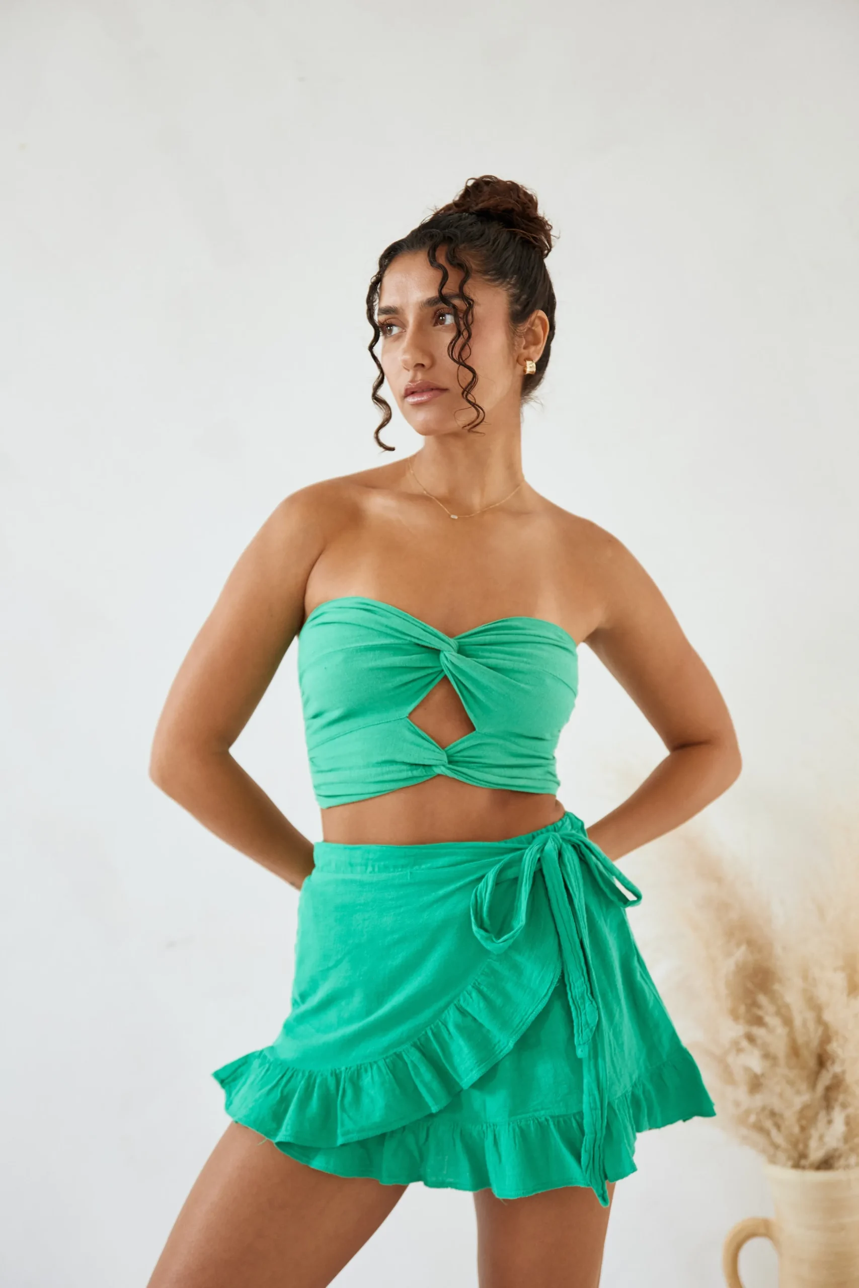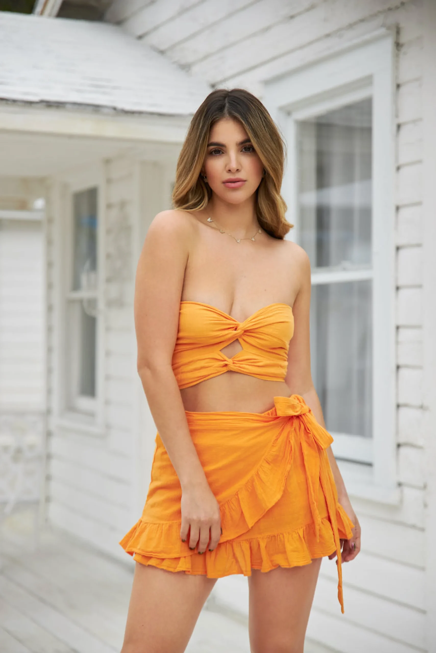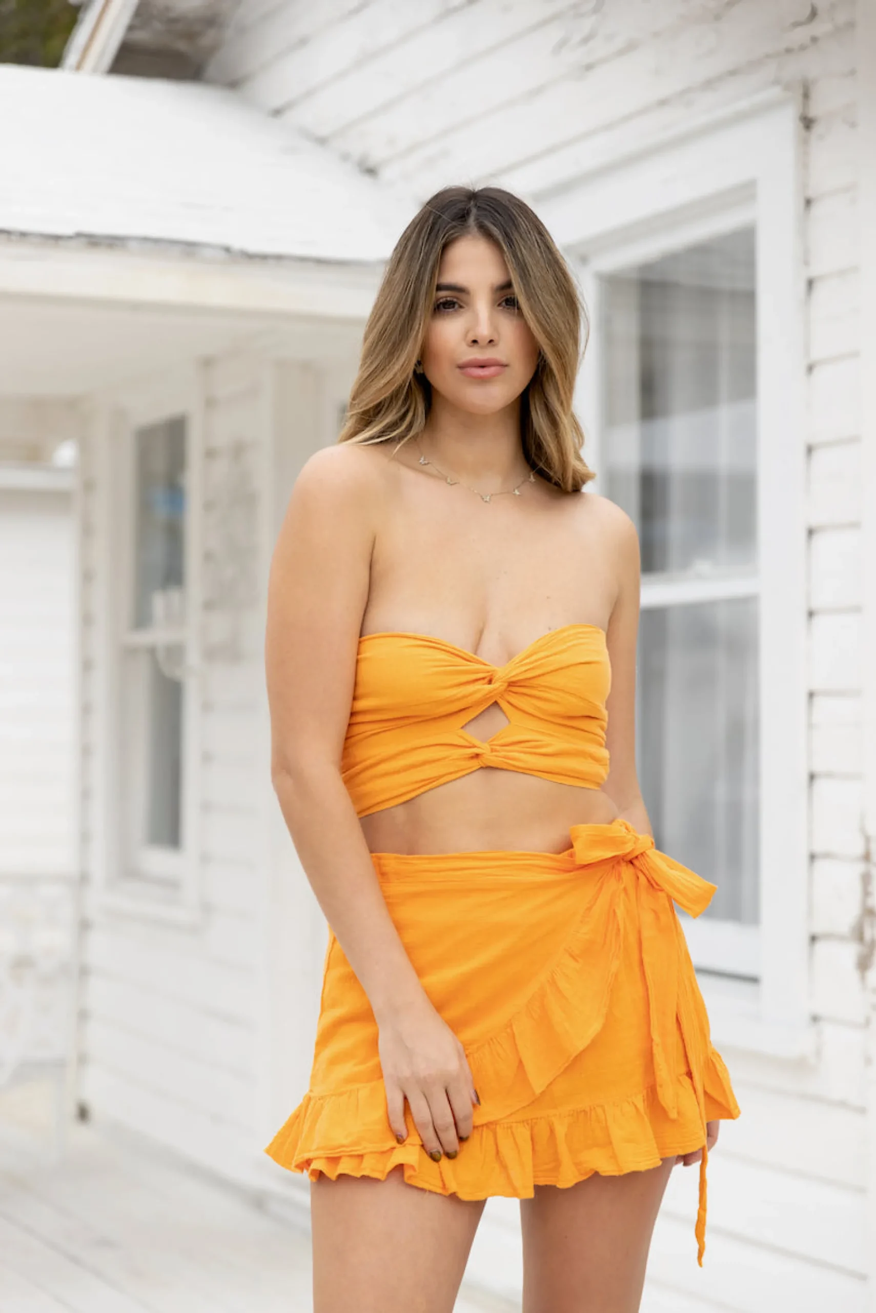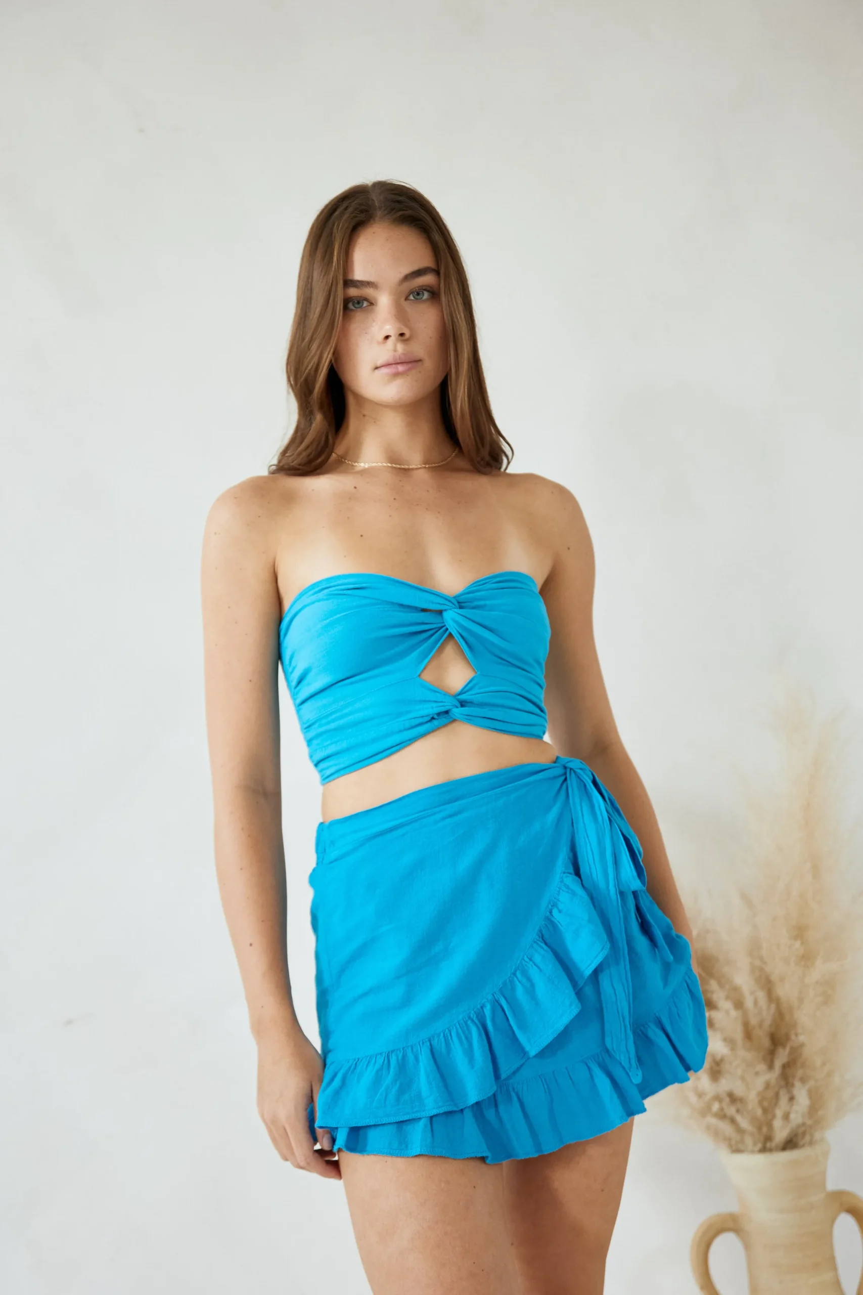 The perfect skirt for brunch or vacation! The Bianca Skirt is made from a high quality natural cotton fabric. It is a high waisted wrap style with shorts underneath, featuring a tie at side waist and ruffle detail. Complete the set with the Sofia Top.