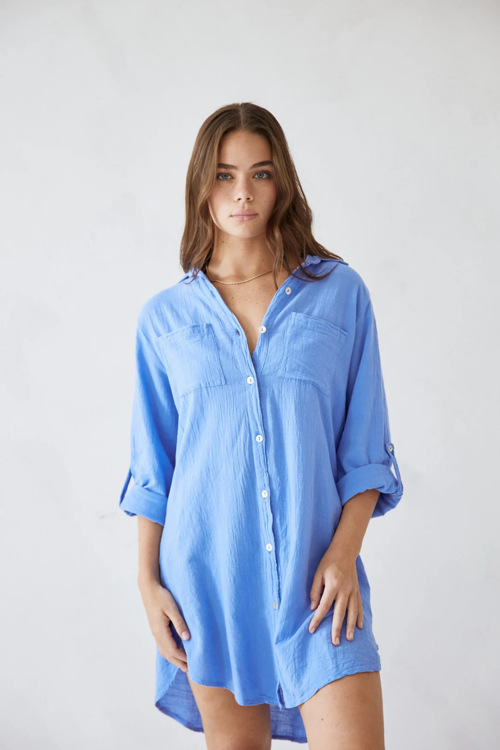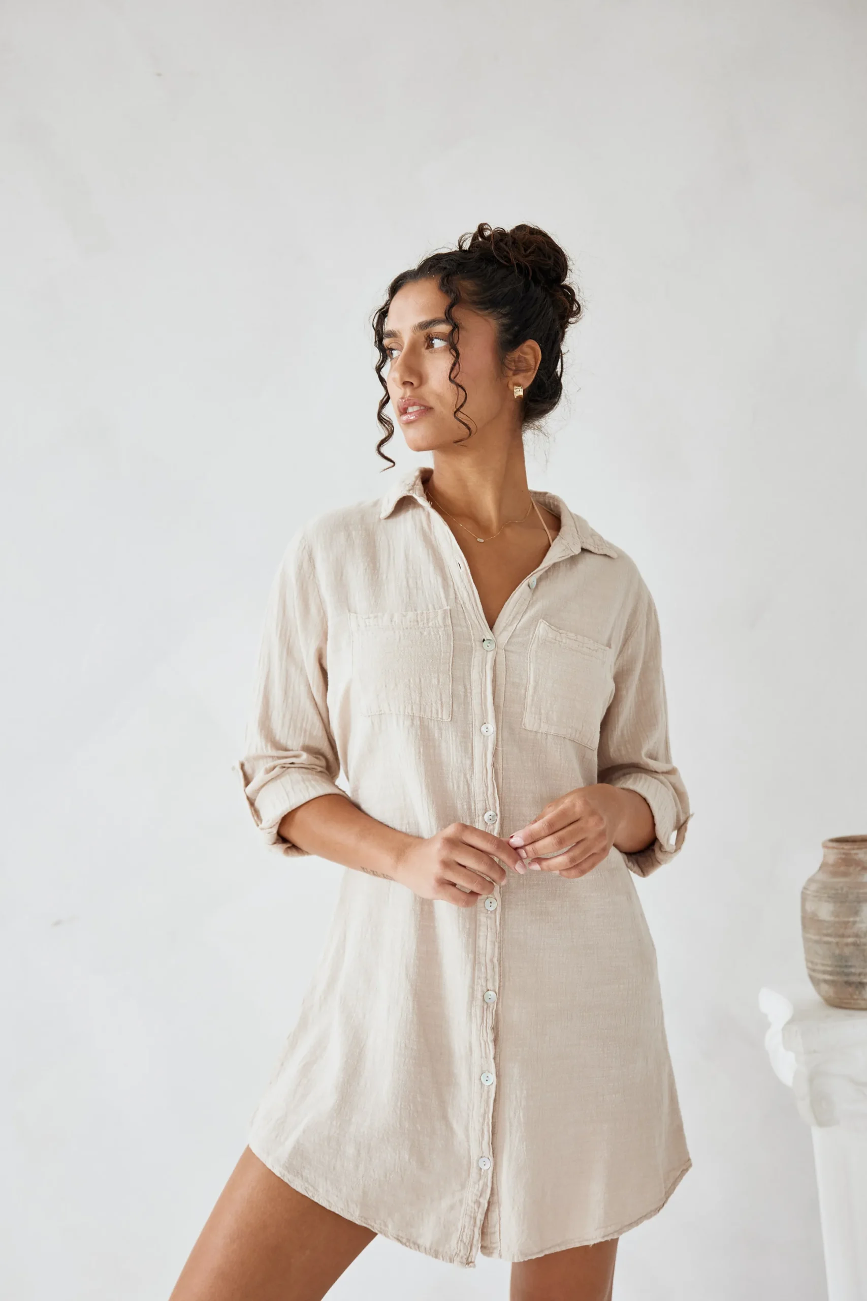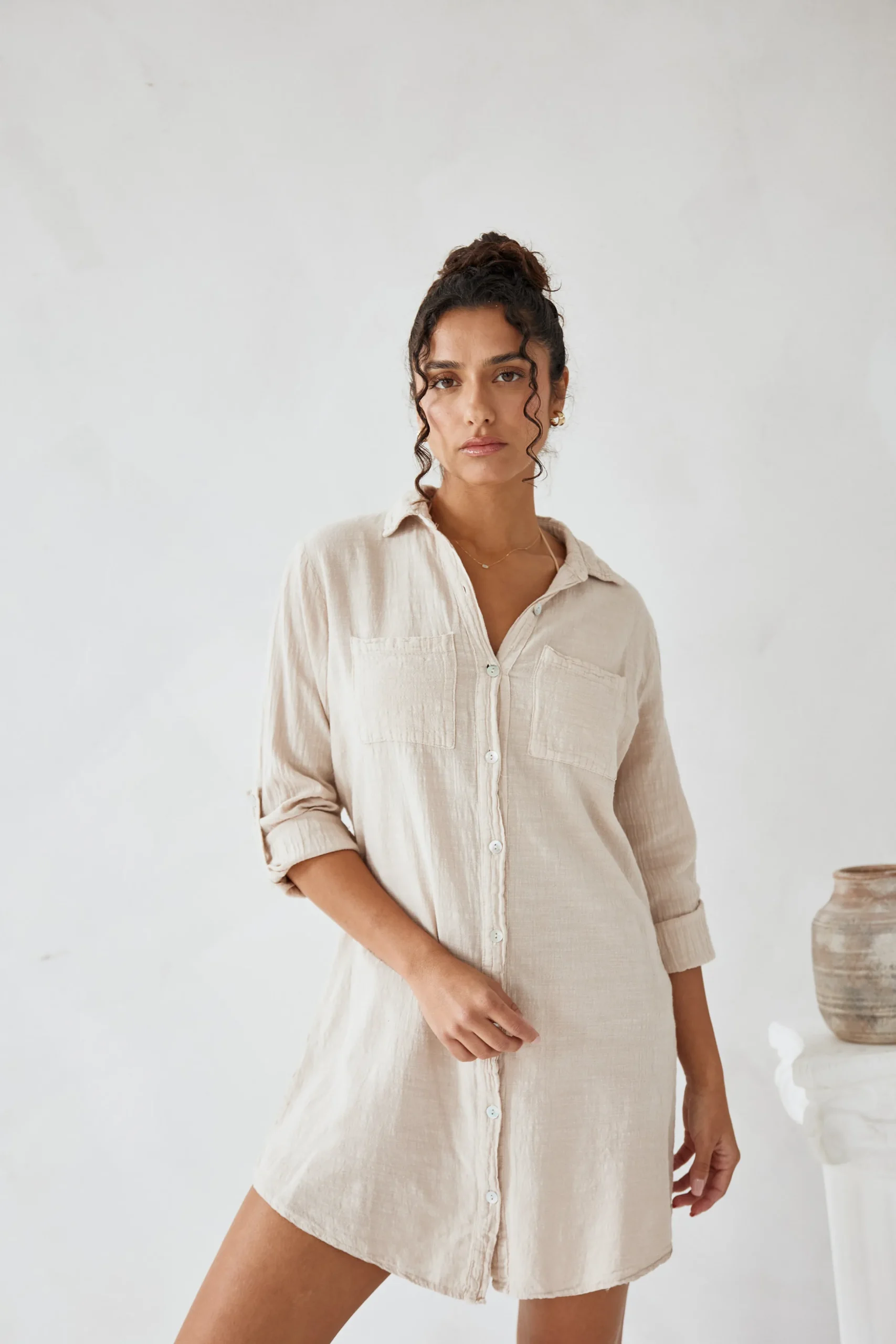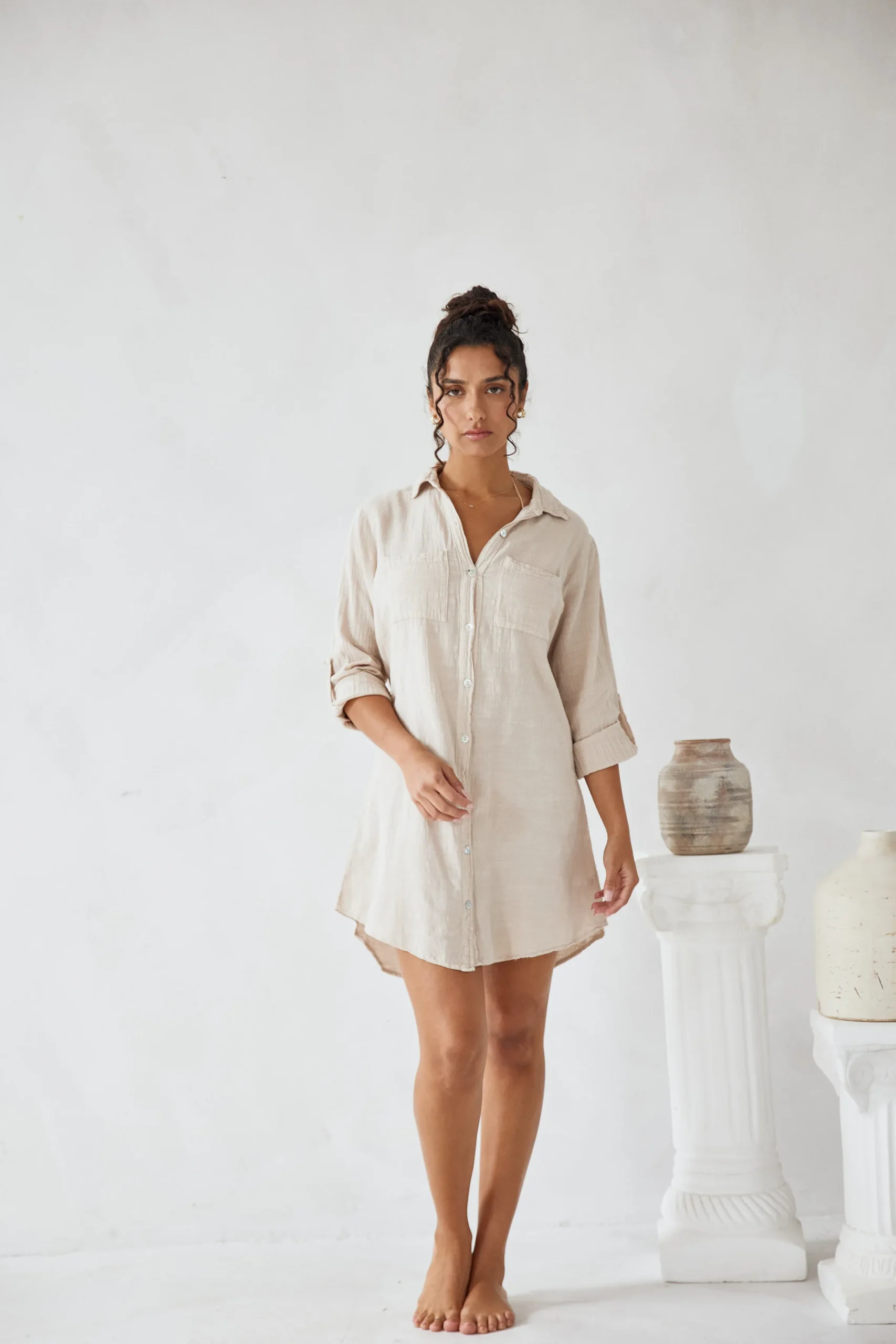 The ultimate beach to brunch look can be achieved in the Cabana ShirtDress! It is made from a high-quality cotton fabric and is designed as a long-sleeve, airy, oversized fit featuring centre front and sleeve buttons. This dress can be worn open over your swimsuit, closed as seen pictured, or tied at the front with cute shorts.