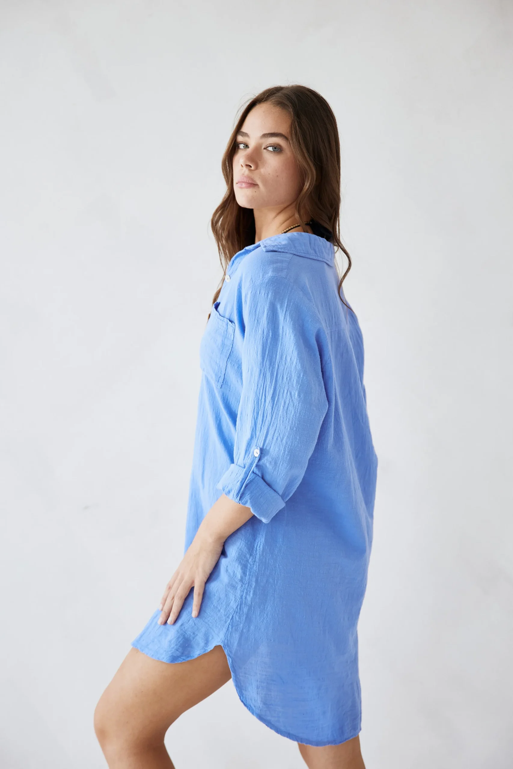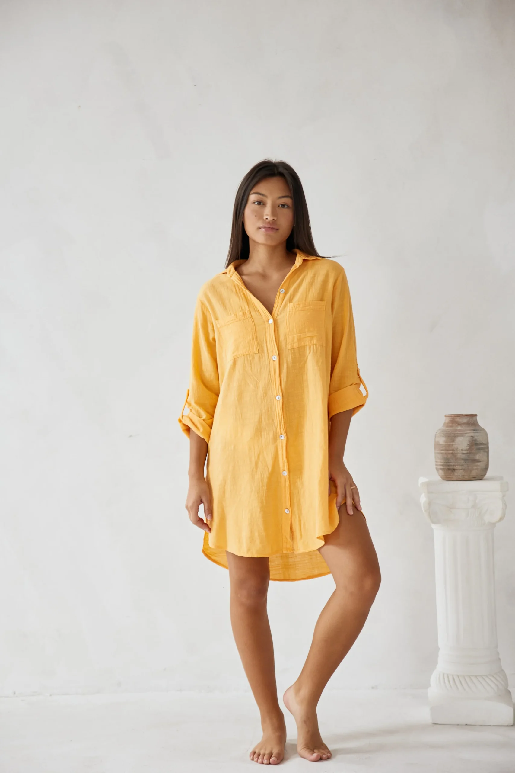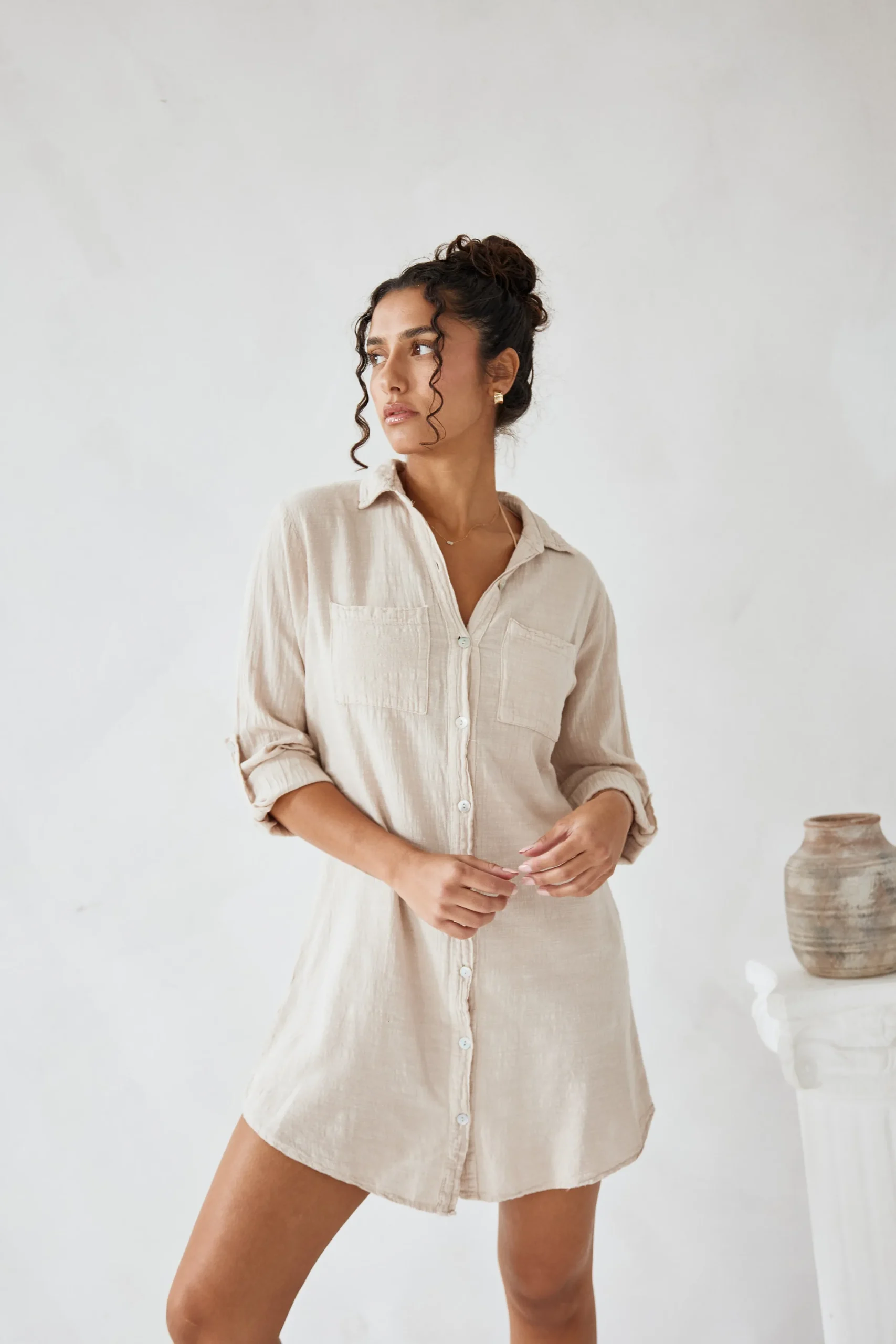 The ultimate beach to brunch look can be achieved in the Cabana ShirtDress! It is made from a high-quality cotton fabric and is designed as a long-sleeve, airy, oversized fit featuring centre front and sleeve buttons. This dress can be worn open over your swimsuit, closed as seen pictured, or tied at the front with cute shorts.