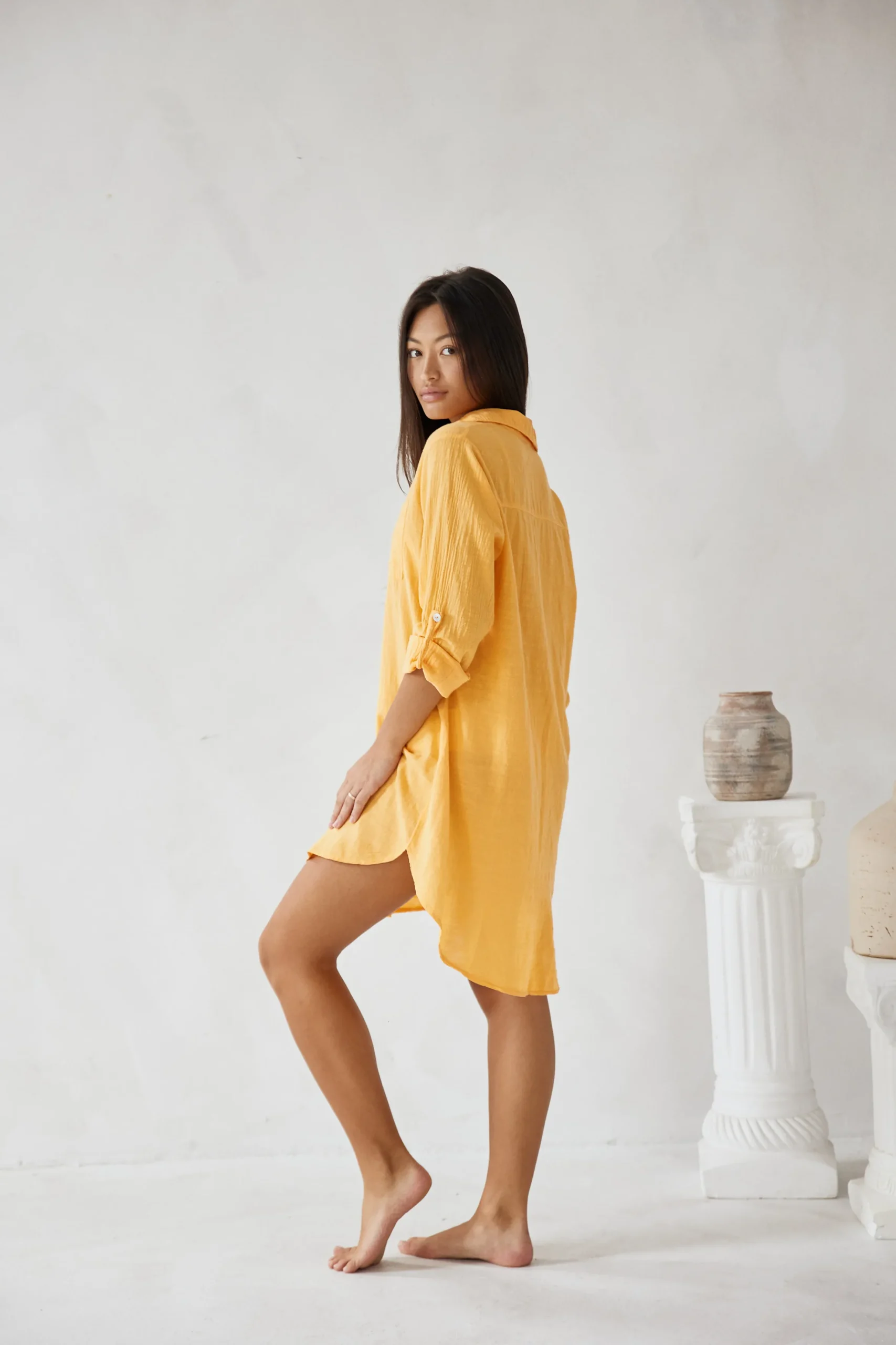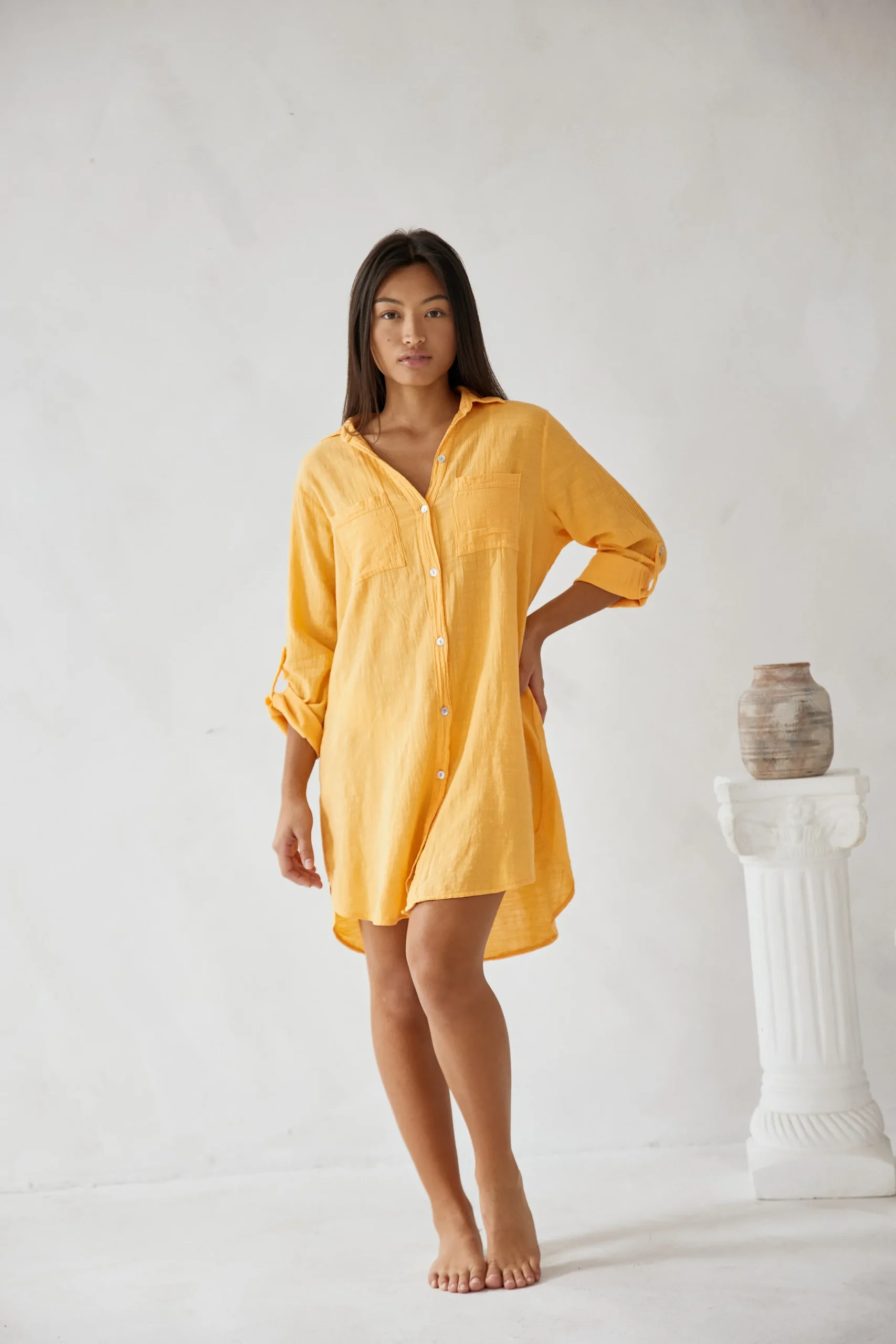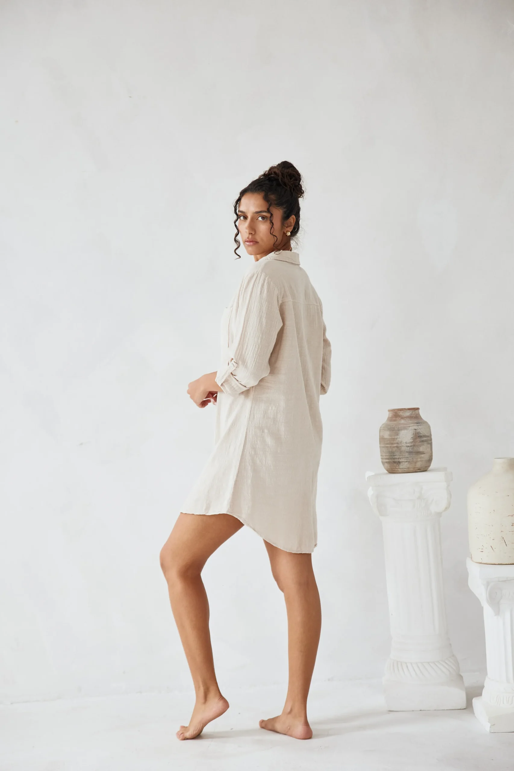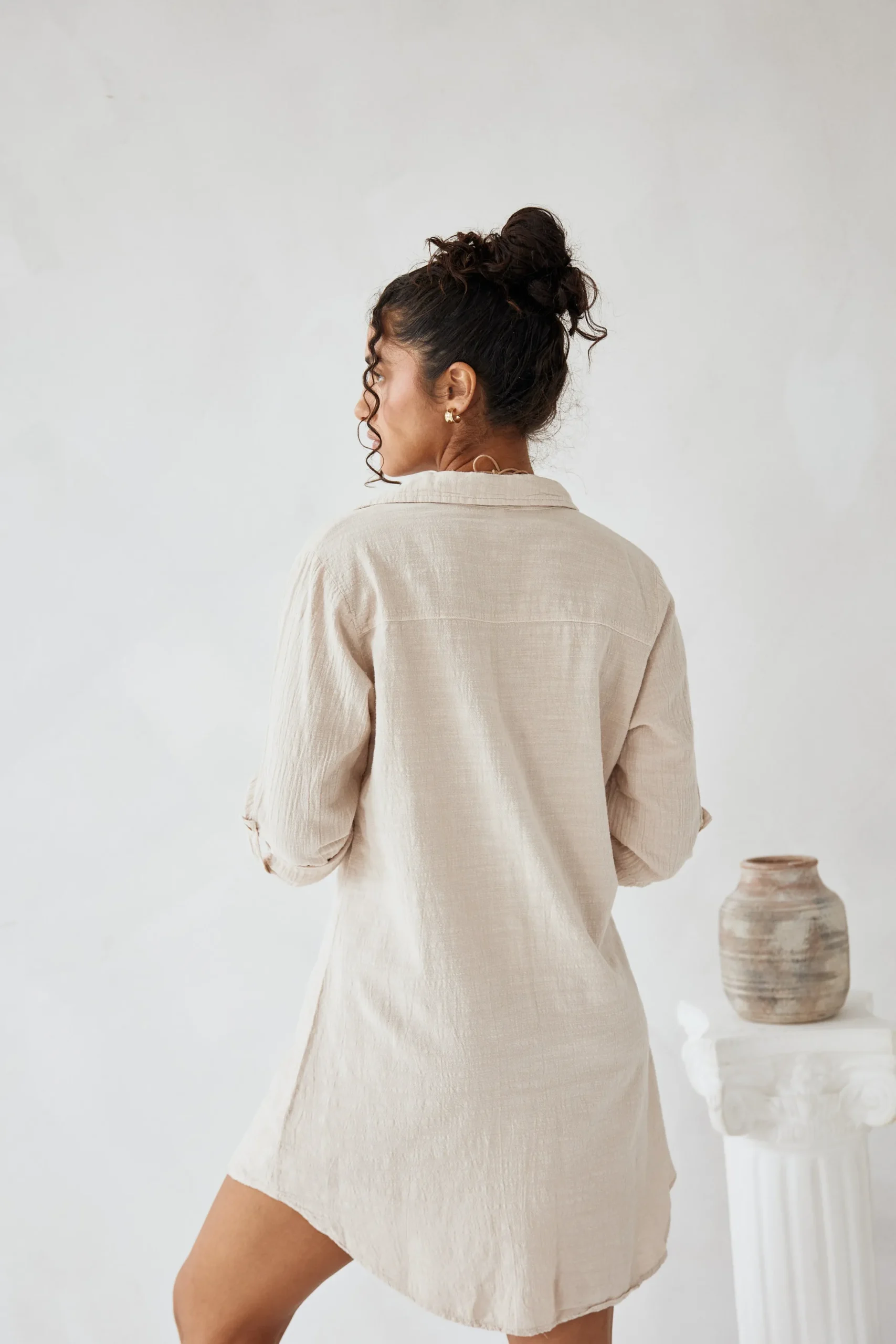 The ultimate beach to brunch look can be achieved in the Cabana ShirtDress! It is made from a high-quality cotton fabric and is designed as a long-sleeve, airy, oversized fit featuring centre front and sleeve buttons. This dress can be worn open over your swimsuit, closed as seen pictured, or tied at the front with cute shorts.