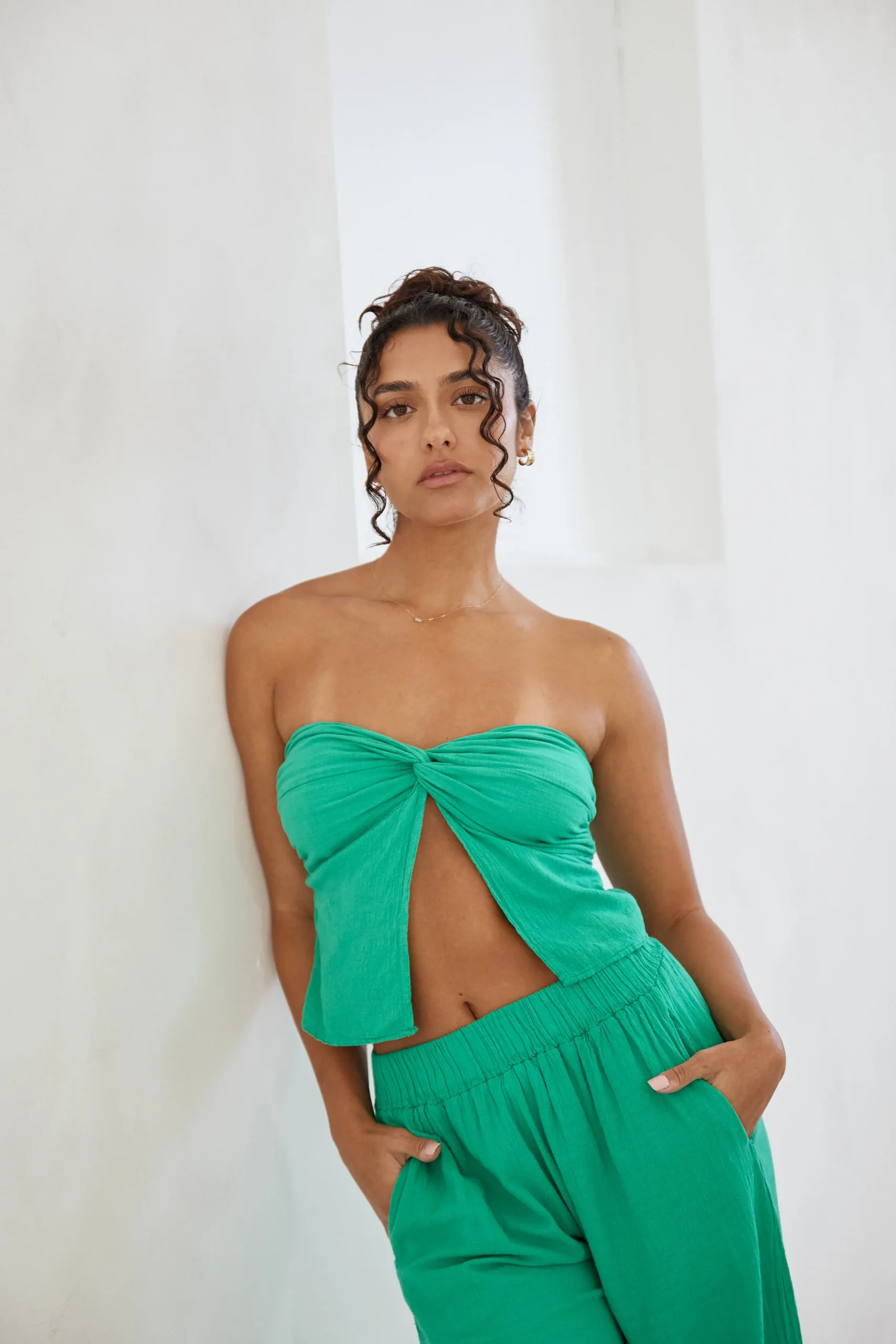Our super cute Cora Top is a must have! It is made from a high quality cotton fabric. It features a twist front detail, fully elastic back and a split front opening. Complete the vibe with any of our bottoms for a fun flirty look.