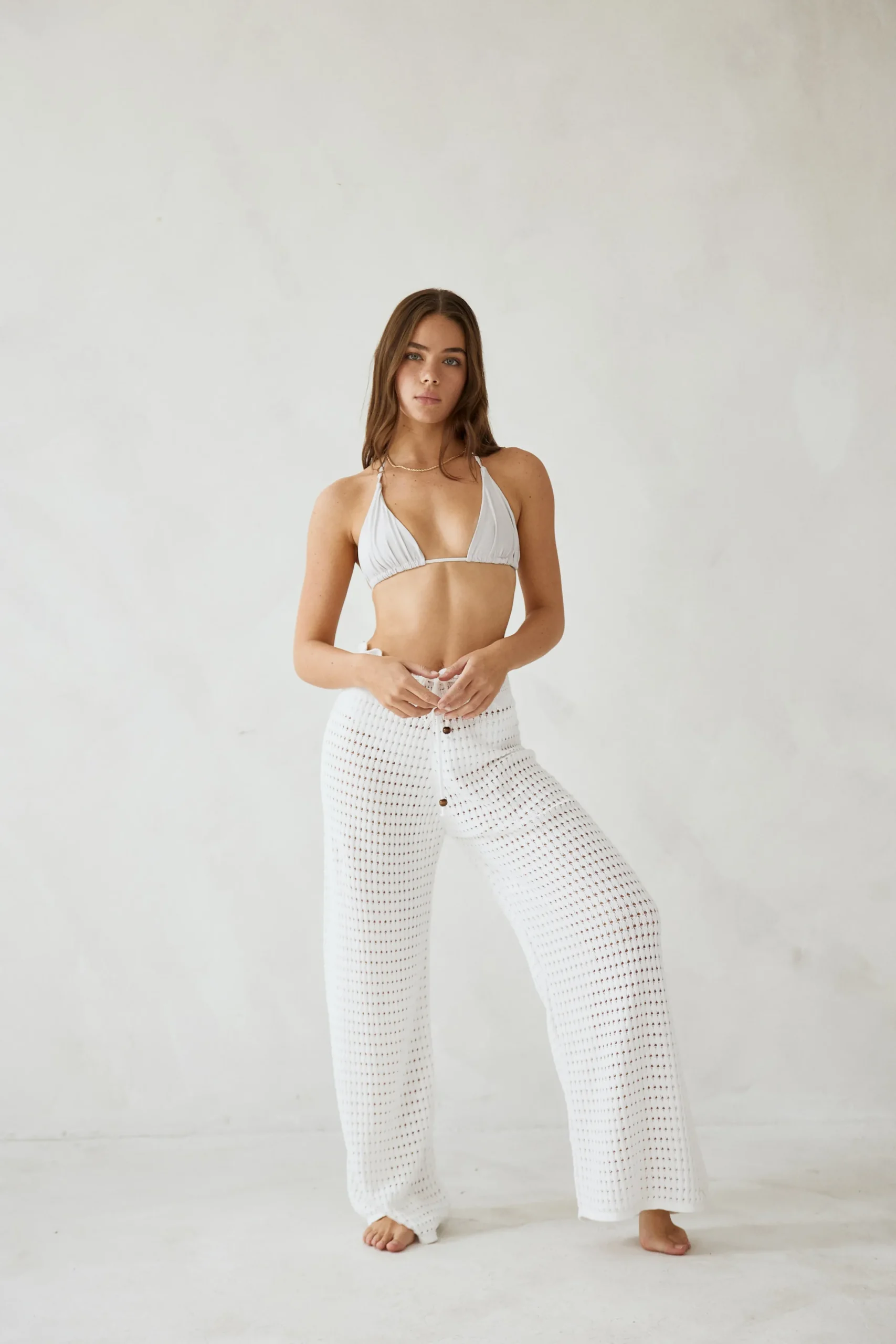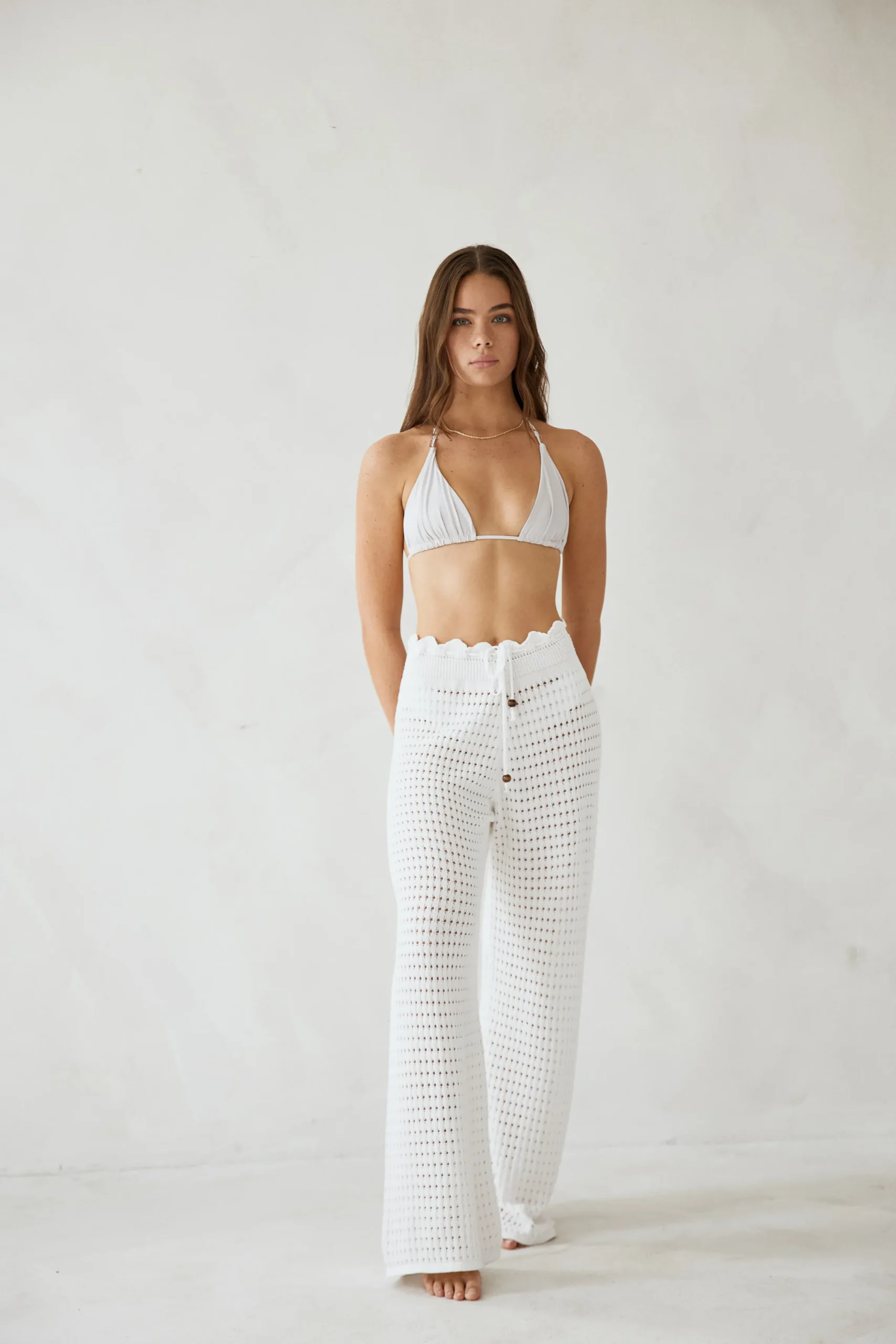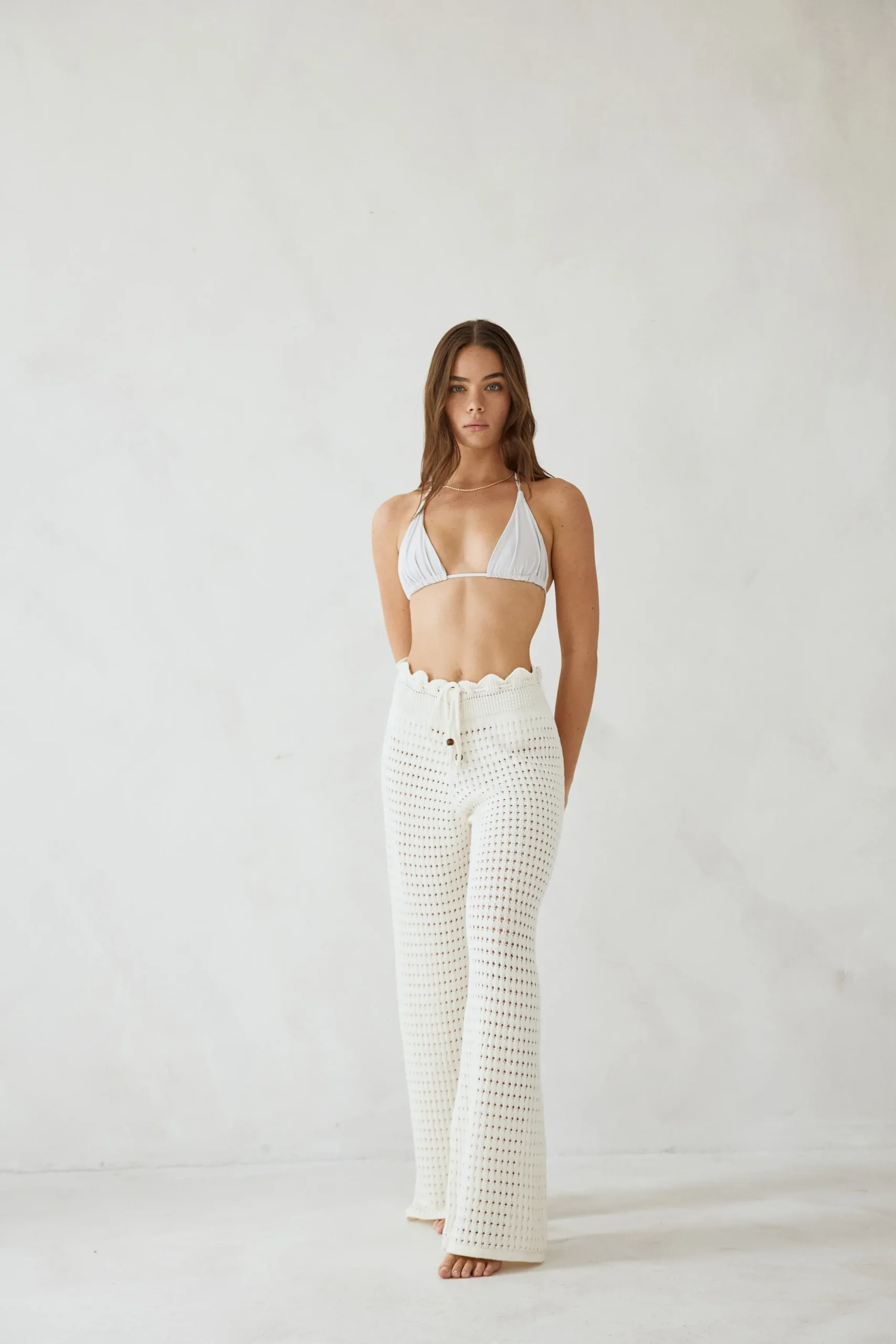 Elevate your look with the Demi Pant! Designed from a soft cotton blend crotchet, this pant is the perfect style for your next beach bar or festival. This high-waisted style features an adjustable beaded drawstring and a ruffled waist detail.