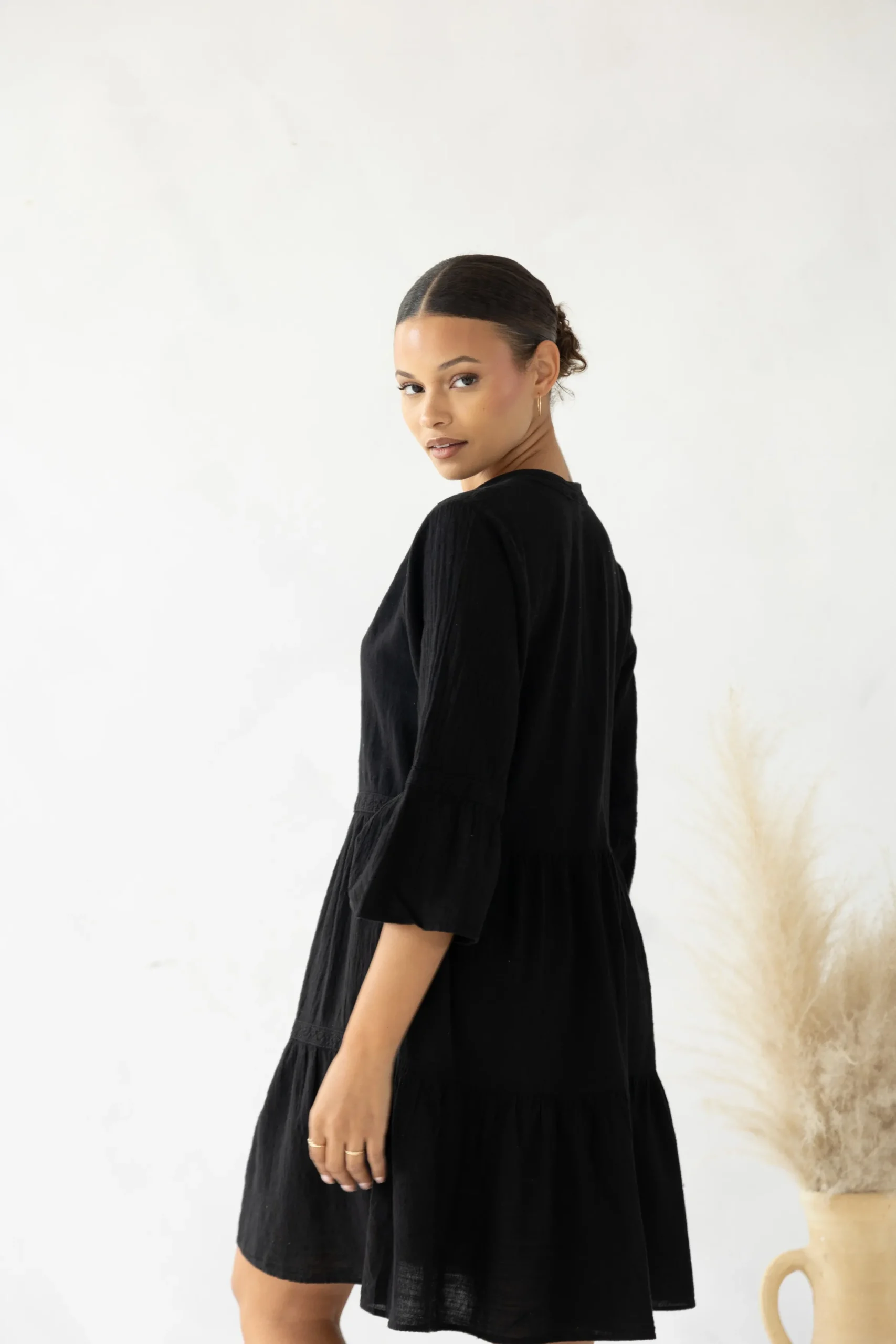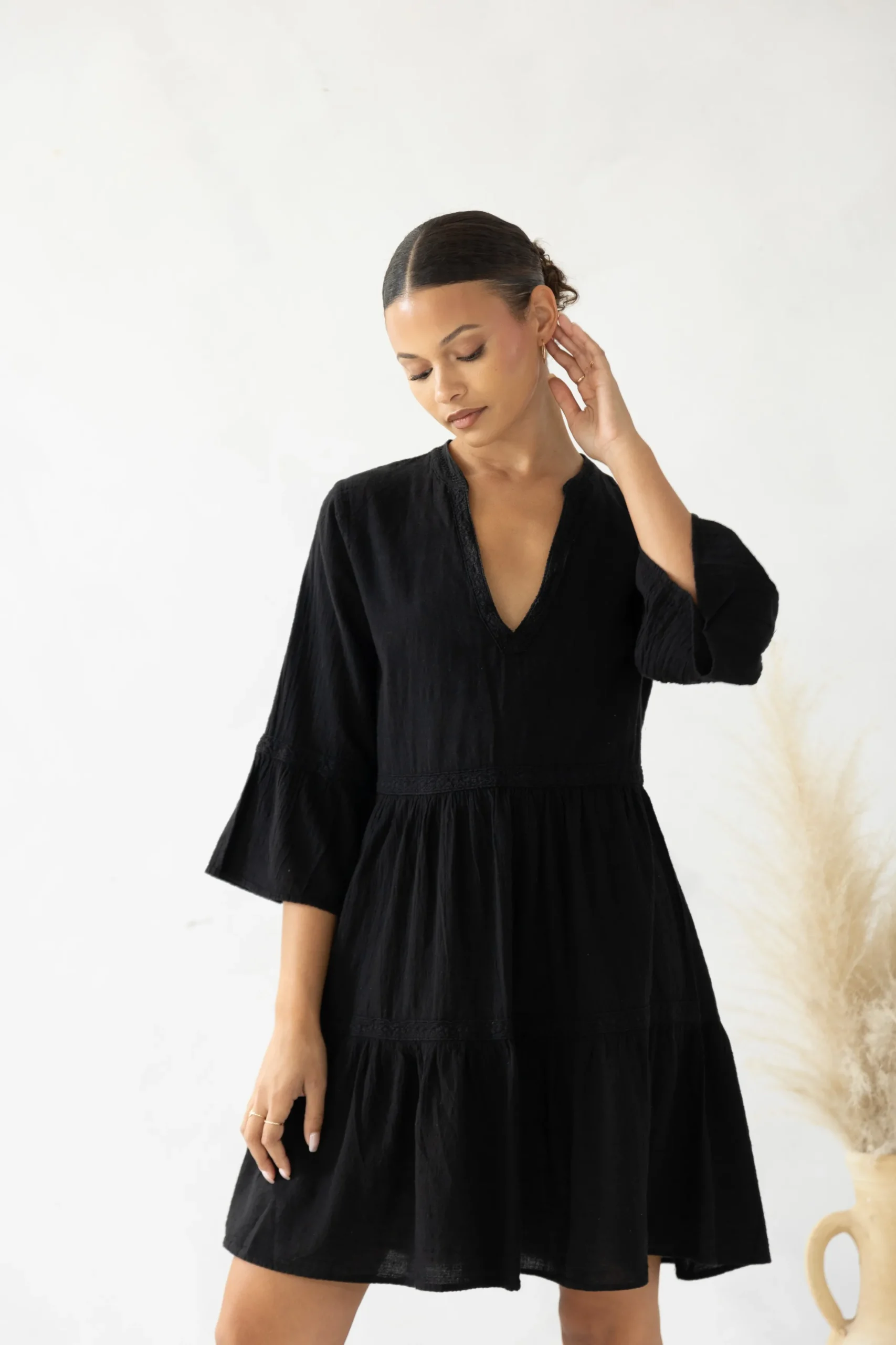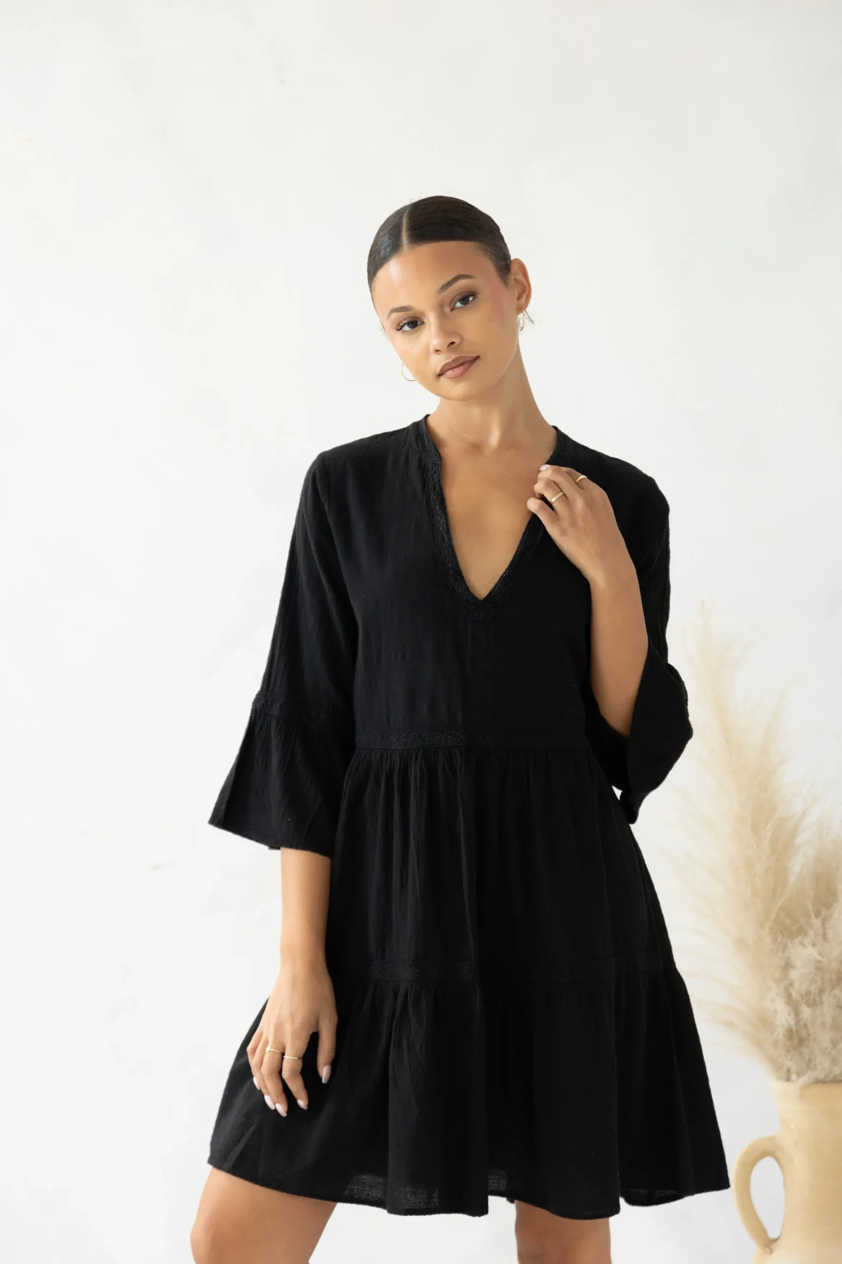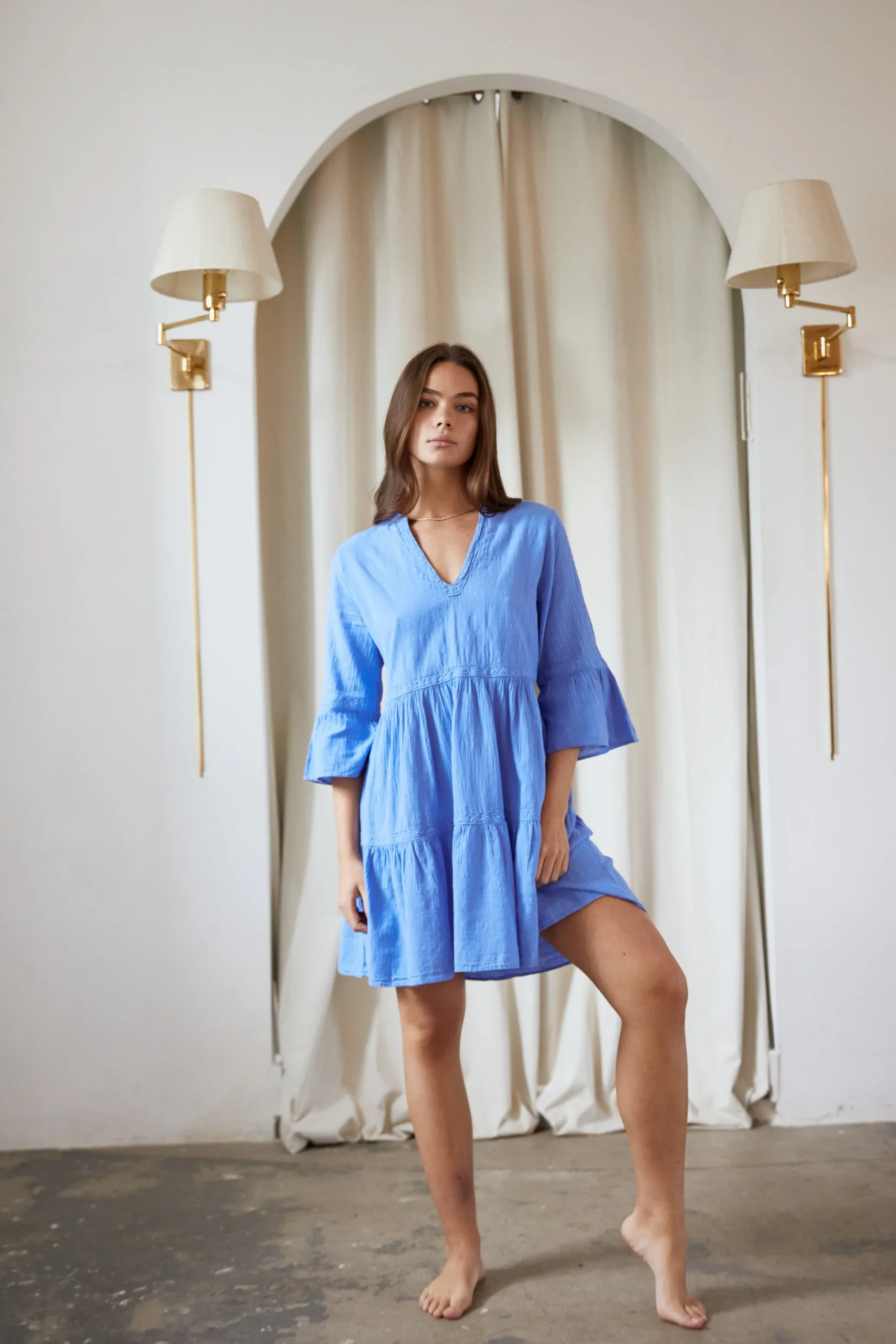 The perfect dress for vacation or a casual outing! The Gabbi Dress is an airy mini dress that features a V-neck and ruched detailing. This everyday style is made from a high quality natural cotton fabric. Worn best with sandals or sneakers.