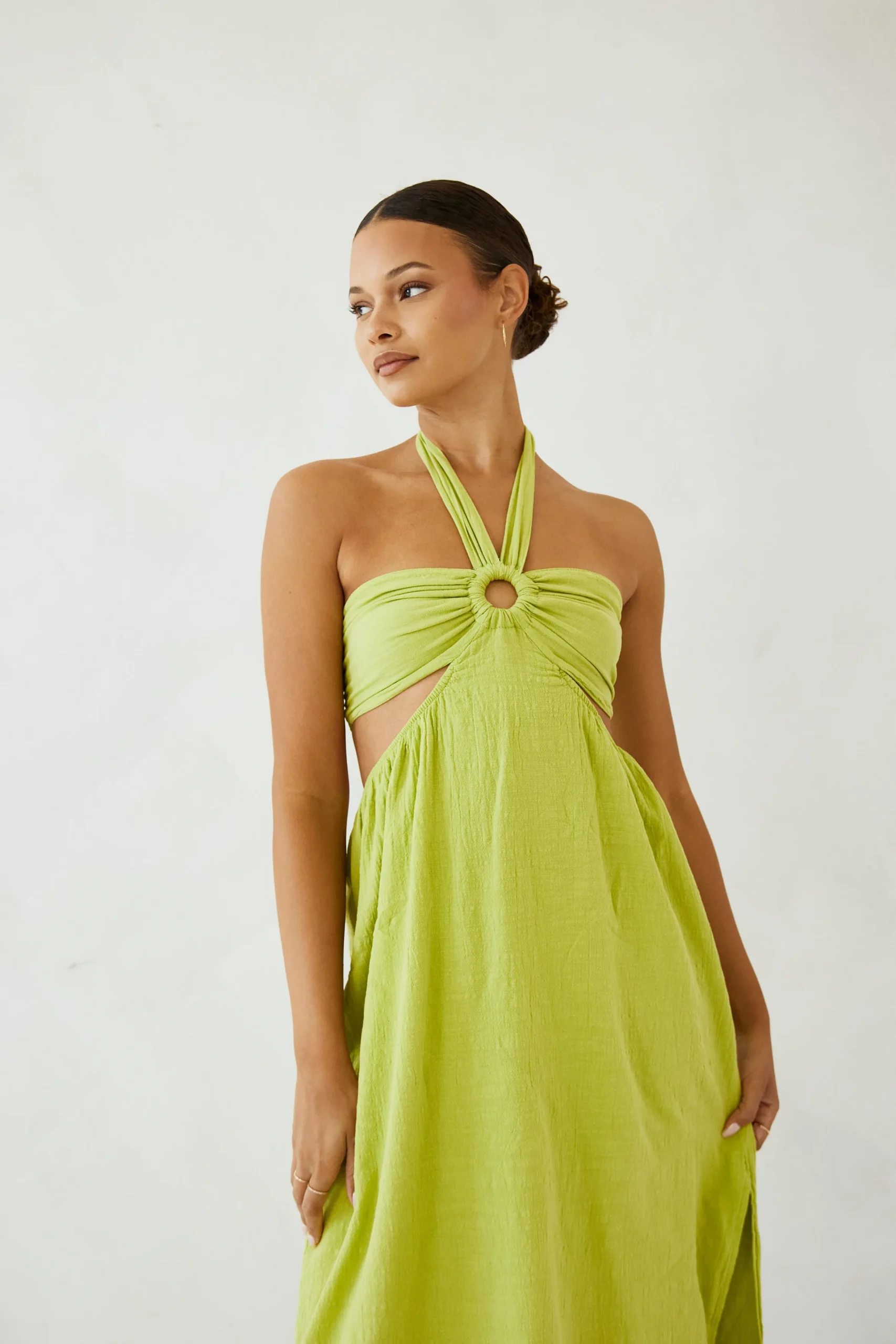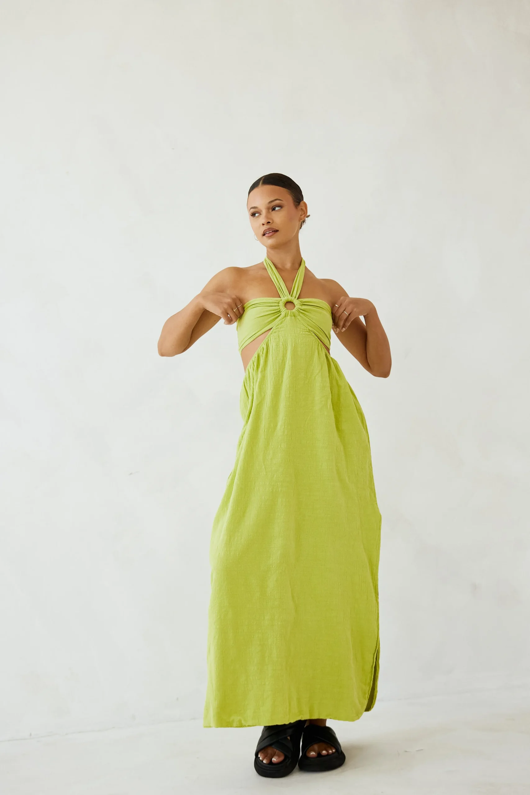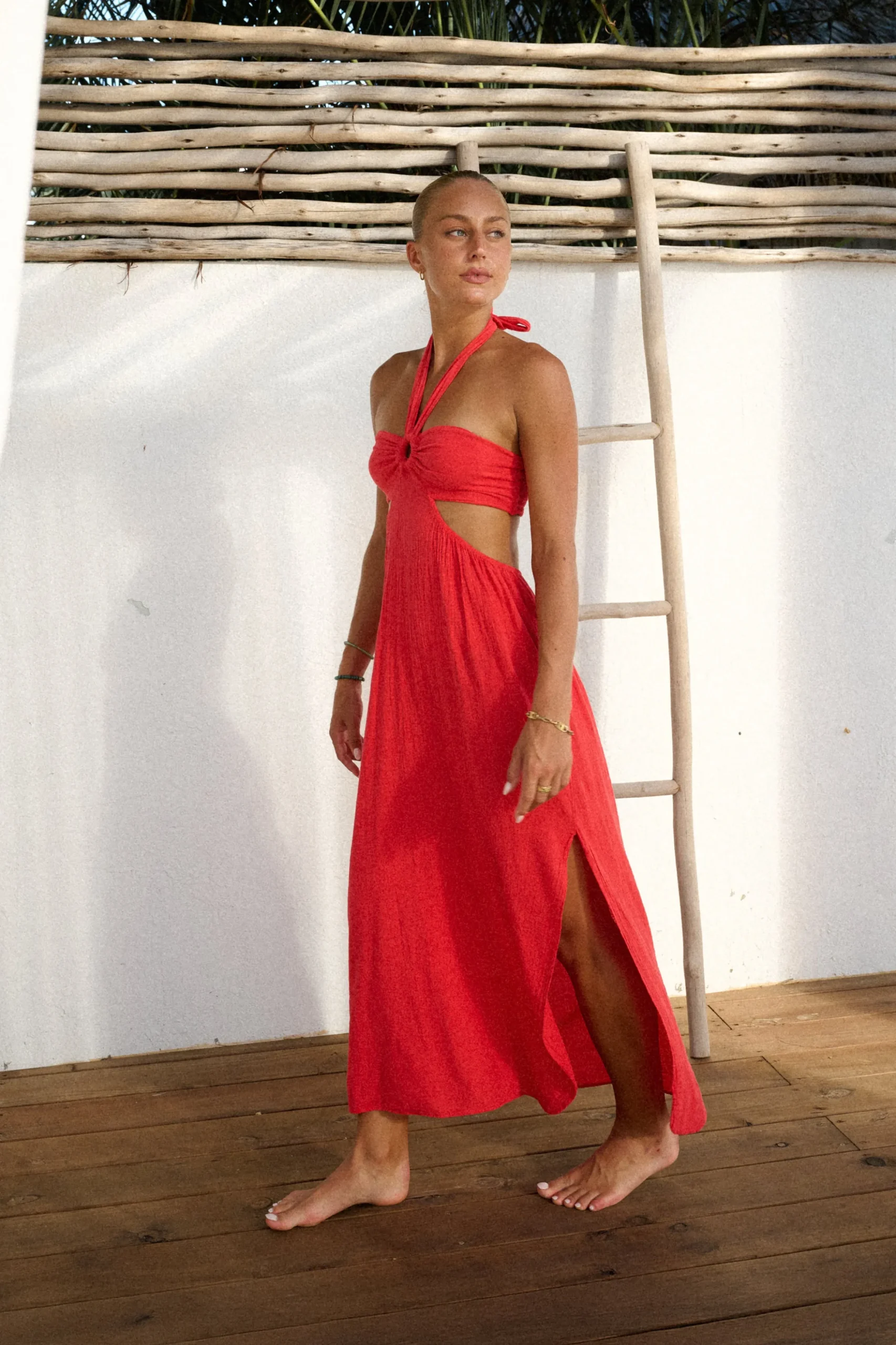 Make a statement in this dress! The Giovanna Dress is made from a high quality cotton fabric. It is a maxi style featuring a ring at centre bust, halter neck tie, cutout detail at the ribs and an open slit up the leg. Dress it up with heels for your next event!