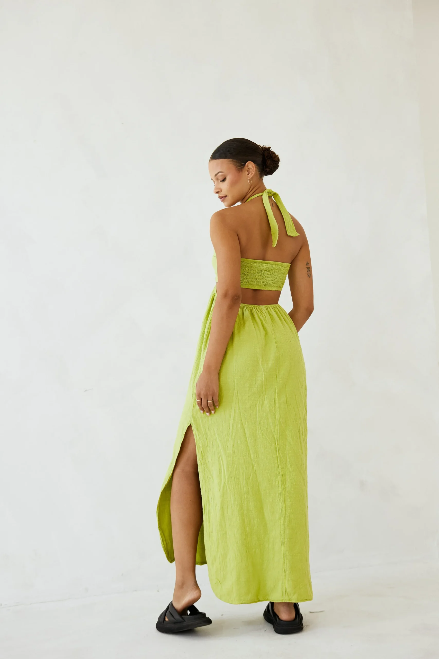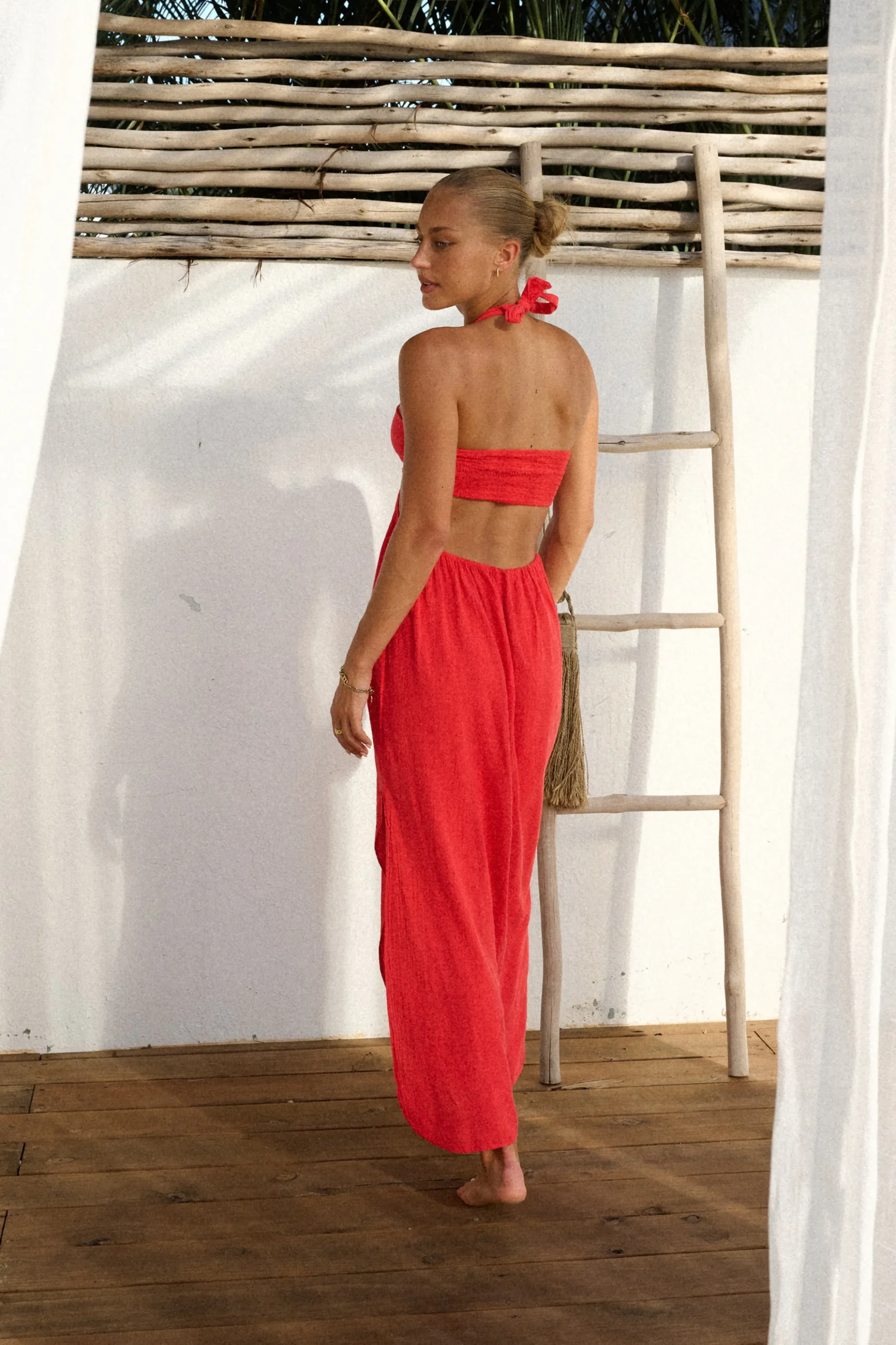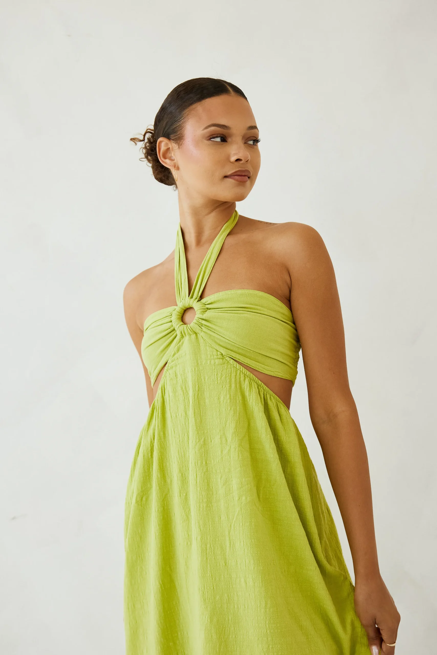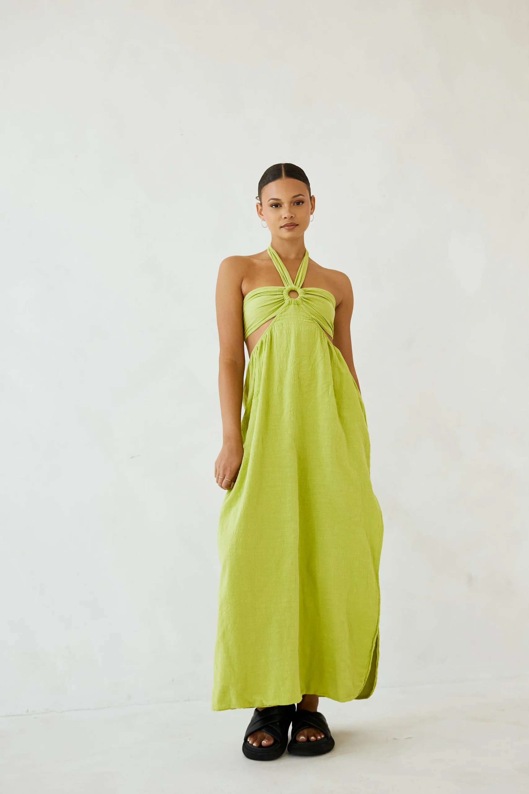 Make a statement in this dress! The Giovanna Dress is made from a high quality cotton fabric. It is a maxi style featuring a ring at centre bust, halter neck tie, cutout detail at the ribs and an open slit up the leg. Dress it up with heels for your next event!