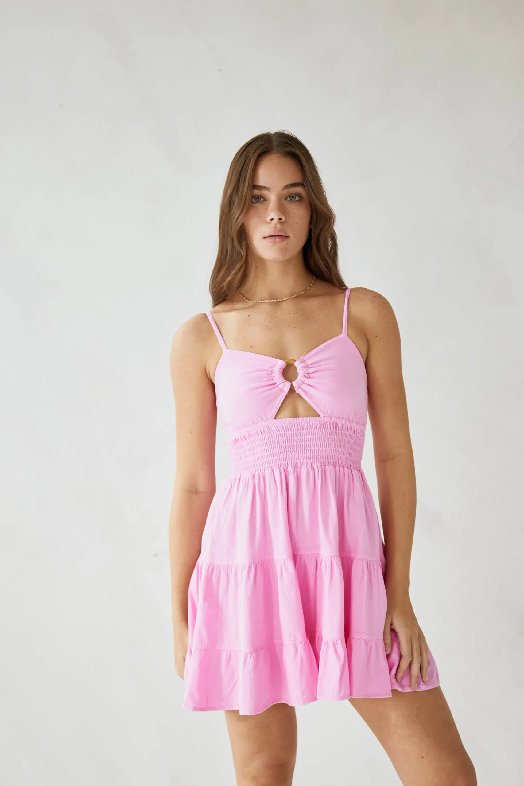 The perfect piece for your next vacation! The Kattia Dress is made from a high quality cotton fabric. It is a mini style featuring a ring at centre bust, adjustable straps, cutout detail and a ruched trimming detail on the skirt. Style it with heels or keep it casual with sandals!
